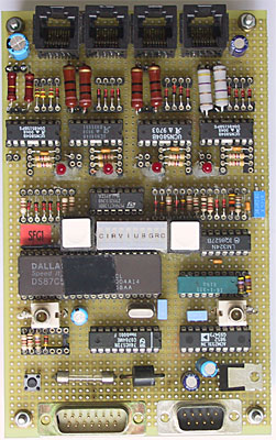 Unidad de control CFS para cuatro motores paso a paso.El montaje de los componentes se ha realizado sobre una tarjeta de prototipos usando la técnica del grapinado. Solo en caso de frabricar suficientes tarjetas merece la pena diseñar y fabricar un circuito impreso. Es un trabajo laborioso aunque nos permite montar solo lo necesario. Por ejemplo la parte del operacional que adapta la salida de enfoque de un LX200 se puede eliminar.
