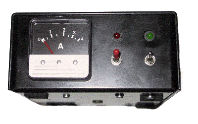 Vista frontal, con amperímetro, interruptor principal e interruptor para los 12v.