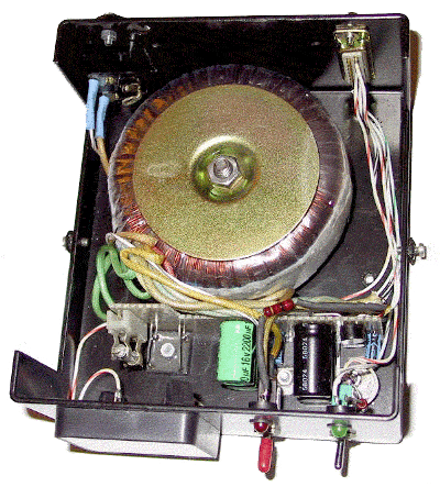 Normalmente serán necesarios dos transformadores, en la presente realización se ha tenido la suerte de encontrar un toroidal con salidas múltiples. Se añade un amperímetro de bajo costo en los 12v para controlar el consumo, aunque no es realmente necesario.