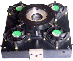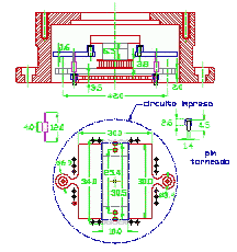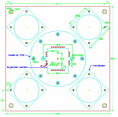 Fig.2 Base indicando la posición de ventiladores y la cubierta del CCD. Piezas para sujeción del CCD y de los módulos peltier dentro de la cubierta.