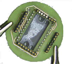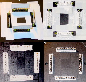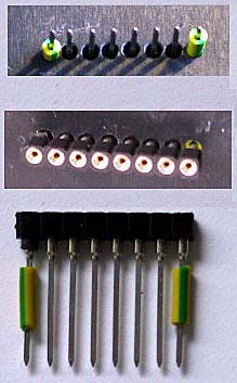 Dos trocitos de cubierta aislante de 2 mm de diámetro ayudan a centrar los pines. Seguidamente se añade el pegamento por la parte torneada. Cuando el pegamento ha endurecido por esa parte se retiran los aislantes y se añade el pegamento que falta.