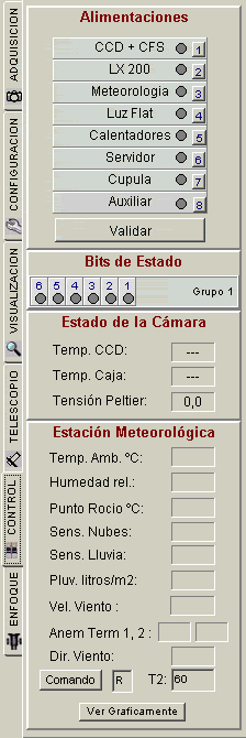 La pestaña de control permite activar o desactivar los distintos equipos del observatorio a la par que muestra el estado del mismo.