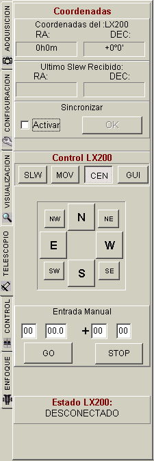 Esta pestaña está destinada a telescopios tipo LX200 o compatibles. Su función es auxiliar ya que el telescopio suele ser comandado desde el planetario.