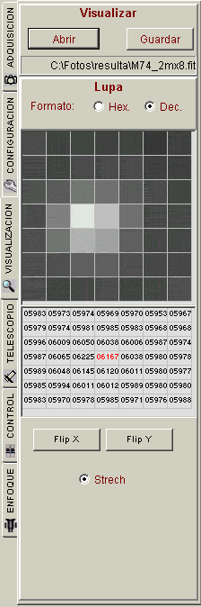 Lupa amplia la imagen, ya sea la recién adquirida o la obtenida de ficheros. A medida que se arrastra el ratón sobre la imagen, apretando el botón derecho, la lupa amplia la imagen y muestra el valor de los pixeles en decimal ó hexadecimal.