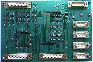 En la cara de conectores, los dos DB25 de la parte inferior son para las cámaras, el de arriba es para control de potencia y sensores tipo fin de carrera y otros. Arriba a la derecha un DB15 para la alimentación y cuatro DB9 para los puertos serie. El de abajo del todo sirve también para la programación del modulo mediante un cable cruzado completo no haciendo falta el cable de programación especial.En la cara de componentes tenemos la FPGA, cuatro chip optoacopladores para el puerto de control de potencia, tres MAX232 y el regulador de 5v. Los dos conectores próximos a los max232 son para conectar el core de Rabbit.