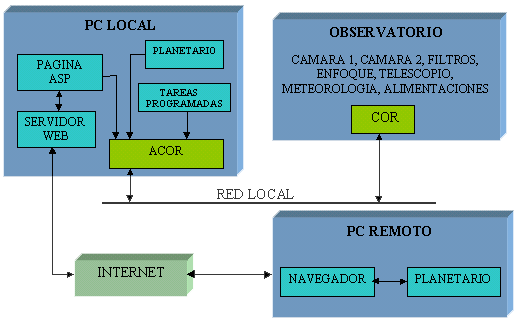 es necesario solo si el observatorio se encuentra muy distante, para ser operado a través de Internet. Para funcionar de esta forma son necesarios dos PCs, el local y el remoto. El PC local ejecuta la aplicación cor a la vez que hace la función de servidor web. Naturalmente para llegar a esta fase, el control en modo local debe estar superado completamente.Fig. 10 - Funcionamiento en modo web.