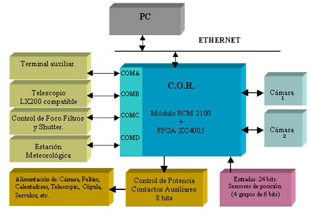 Este periférico permite controlar el encendido de los equipos y monitorizar el estado de diversos intercloks. Para este fin, el cor dispone de 10 bits de salida y 6 de entrada optoacoplados. De los 10 bits de salida es posible usar dos para multiplexar los seis de entrada y poder ampliar a 24 los bits de entrada. Estas entradas pueden usarse para conocer si se ha abierto el observatorio, detectar posiciones prohibidas del telescopio etc.