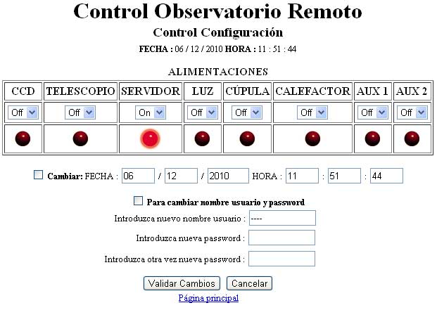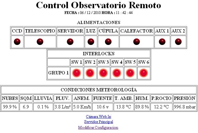 CONTROL: este panel se usa para activar o desactivar la alimentación de los equipos del observatorio y mostrar el estado general del mismo.