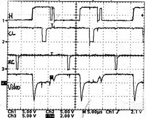 Fig. 2 - Oscilograma generado usando el COR:. una fase horizontal H, el clamping CL, el disparo del convertidor RC, en el puerto paralelo.